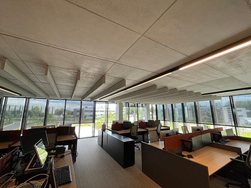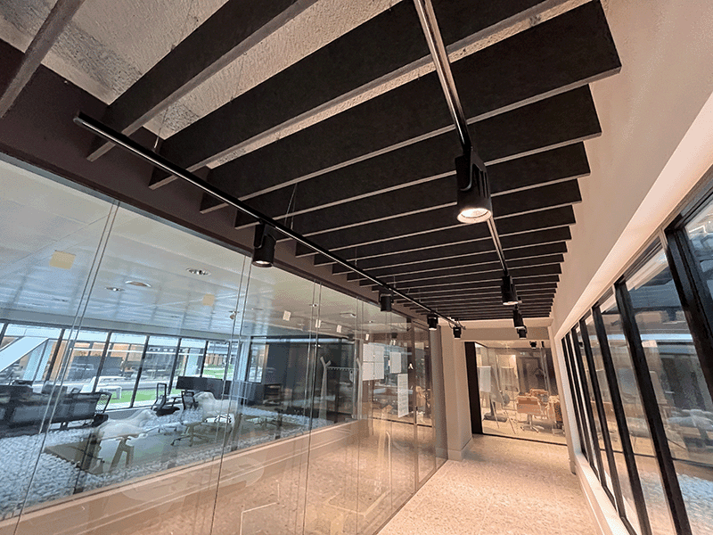 Deze strakke combinatie versterkt zowel de akoestiek als de visuele identiteit van het bedrijf. Zo staat zowel functionaliteit als esthetiek centraal.